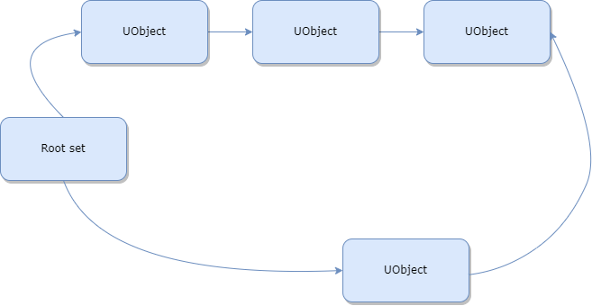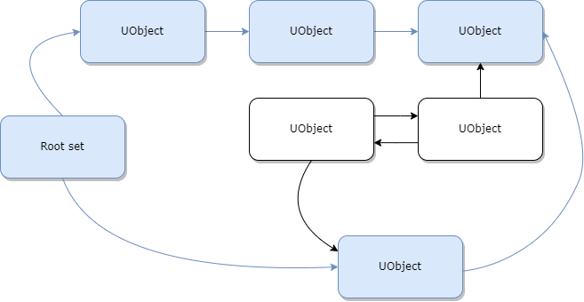 언리얼 엔진에서는 참조(Reference) 그래프를 만들어 어느 오브젝트가 사용중이고 어느 것이 사용중이지 않은지 확인한다. 루트에는 Root set가 있으며 UObject가 아래에 추가된다. 가비지 컬렉션이 발생하면 엔진은 Root set부터 시작해서 트리를 검색한다. 여기서 찾지 못한 오브젝트는 참조되지 않는 오브젝트이므로 해제하고 제거한다. 아래의 그림들을 통해 과정을 살펴보자.
