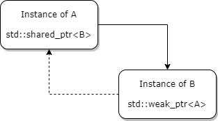 만약에 객체 간 순환 참조가 있다면 어떻게 될까? 참조 카운터가 영영 0이 되지 않으므로 해제 되지 않는다. 이를 해결하기 위해서 기존의 참조를 강한 참조(strong reference)라고 하고 약한 참조(weak reference)라는 개념을 만들었다. 위의 그림으로 봤을 때 객체 A가 객체 B를 소유하면, 즉 소유권 방향의 참조는 강한 참조인 shared_ptr를 사용하고 그외에는 약한 참조인 weak_ptr을 사용한다.